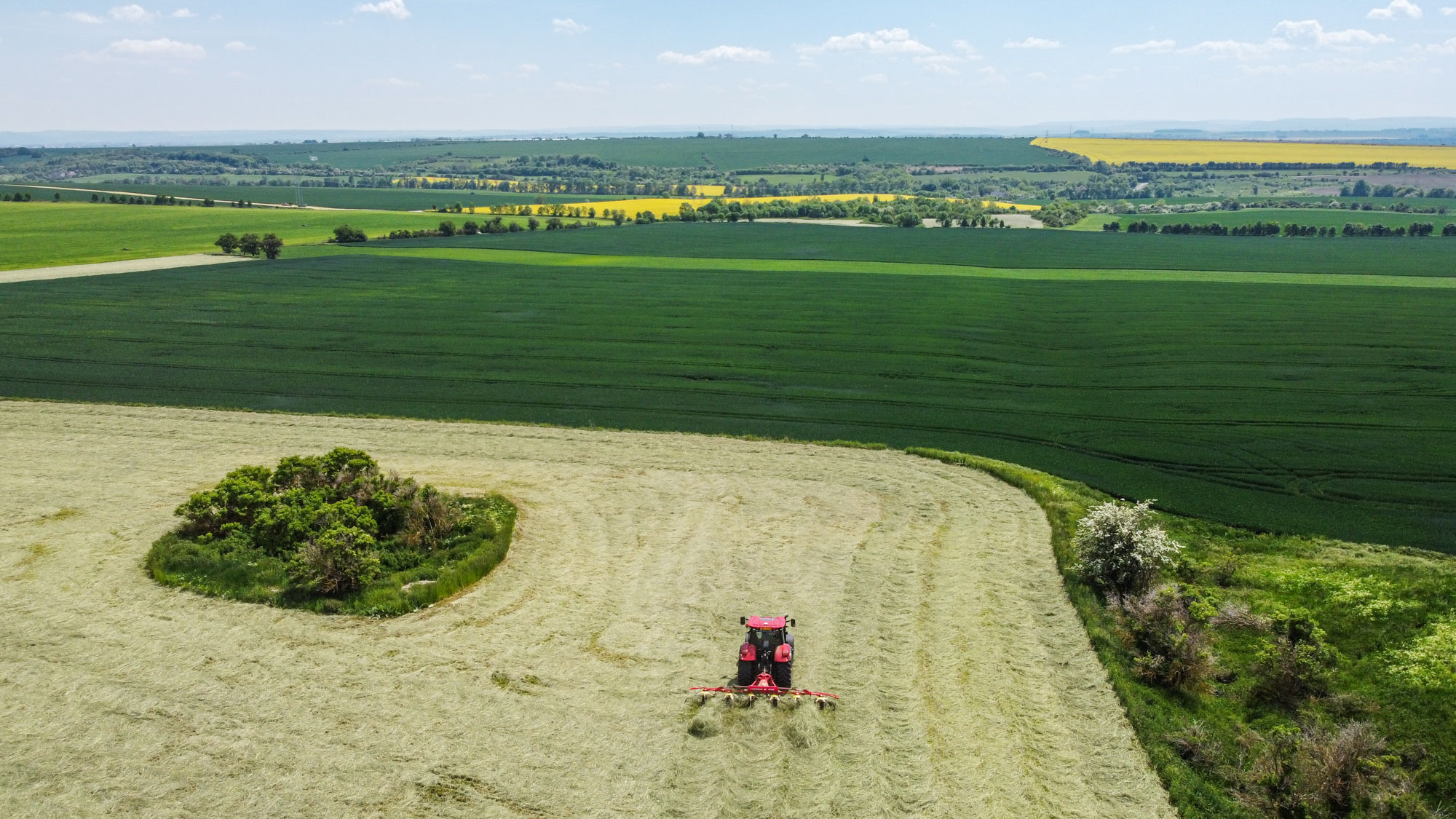 Komfortní čtyř sloupková odpružená kabina „Surround Vision“ s topením a filtrací nasávaného vzduchu, hlučnost 69 dB(A), tónovaná skla kabiny, sluneční clona předního okna, otevíratelné střešní okno, nastavitelný sloupek řízení a výškově volant