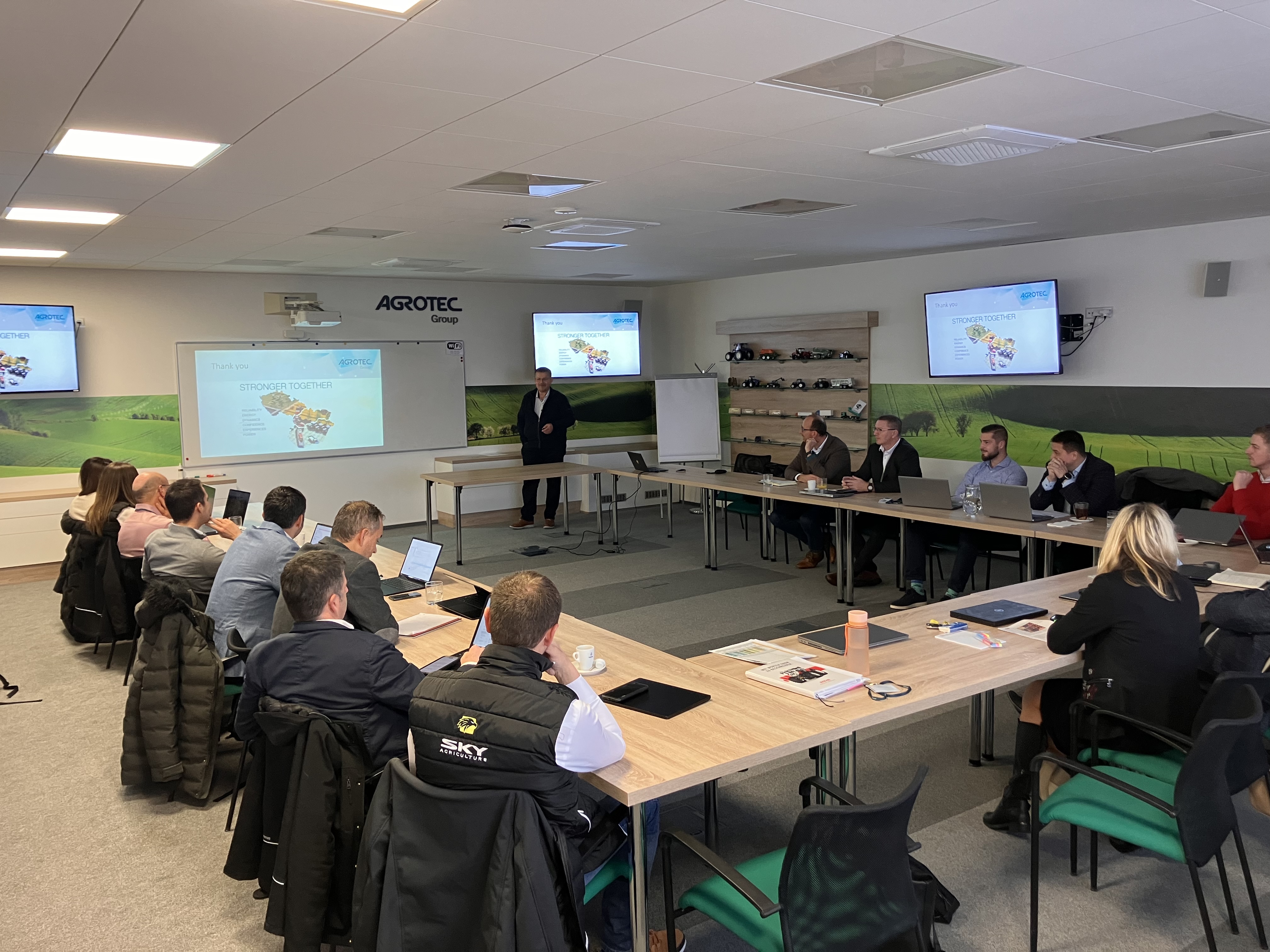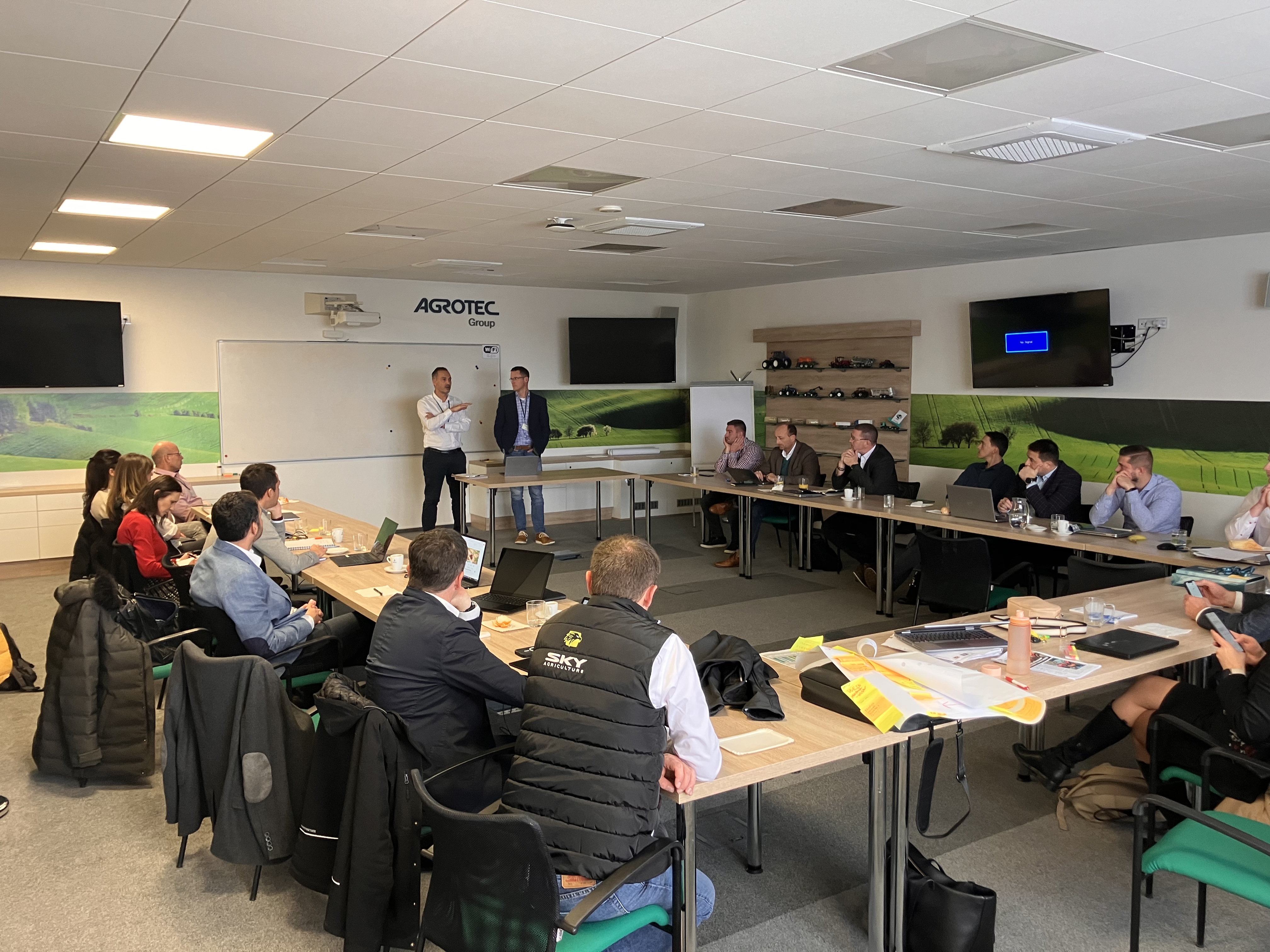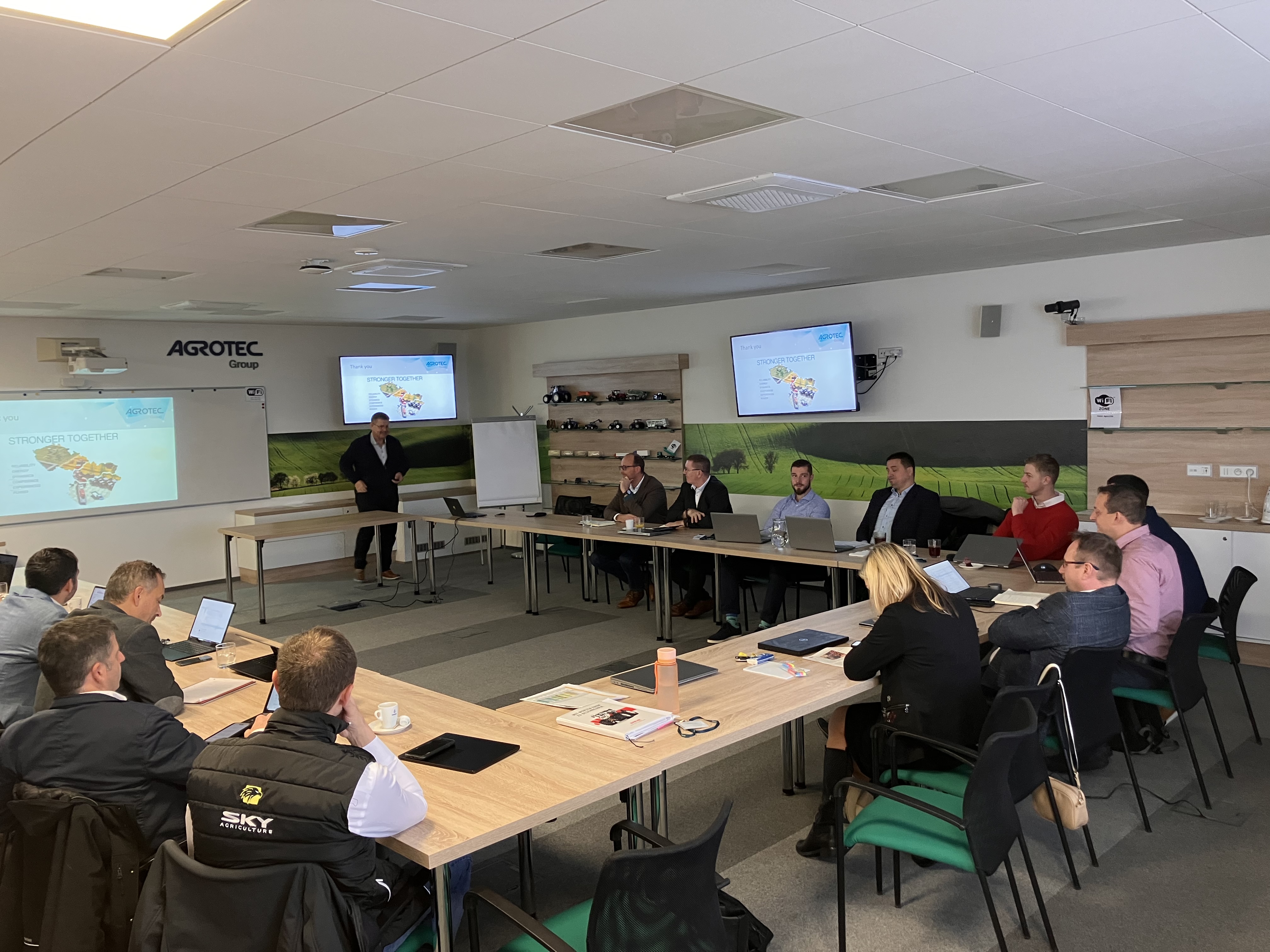 Do Hustopečí dorazilo vedení firmy SKY Agriculture, vedoucí obchodu, servisu, náhradních dílů, logistiky a marketingu. Z české a slovenské strany se účastnilo vedení společnosti AGROTEC Group a AGRI CS, vedoucí a zástupci technického oddělení Atech, vedoucí náhradní dílů Aparts, produkt manažer pro ČR a SK, marketingové oddělení a vedoucí prodeje a vedoucí servisů AGRI CS. Po společné úvodní prezentaci, kde nás všechny přivítal generální ředitel skupiny AGROTEC Group pan Martin Rada, následovala nejdůležitější část dne – pracovní workshopy jednotlivých oddělení.