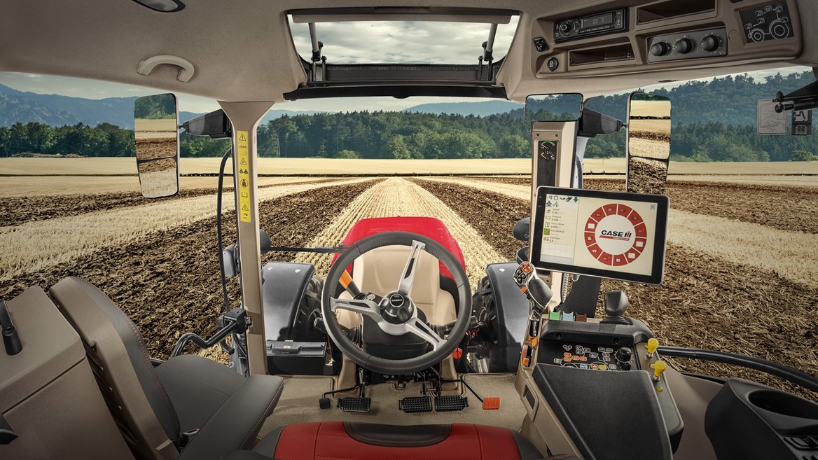 Uvnitř obsluha ocení vynikající výhled do všech stran, prvotřídní kvalitu čalounění a povrchovou úpravou kolem stropu a sloupků. Zážitek z jízdy umocňuje praktický displej v A sloupku s integrovaným zrcátkem a chladicí přihrádkou, která je nyní standardem u všech verzí. Ve volitelné výbavě nechybí ani kožený volant Case IH.