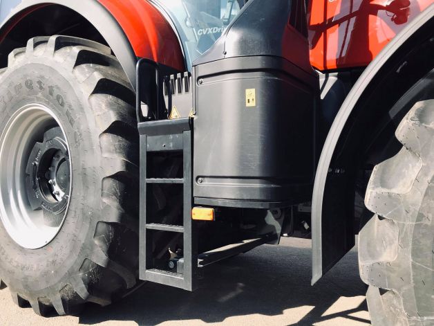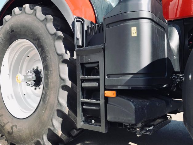 Palivová nádrž traktoru OPTUM 300 CVXDrive nabízí objem 630 litrů pro naftu a 96 litrů pro AdBlue. Dodatečná nádrž (viditelná v úrovni prvního schůdku) poskytuje objem 220 litrů navíc.