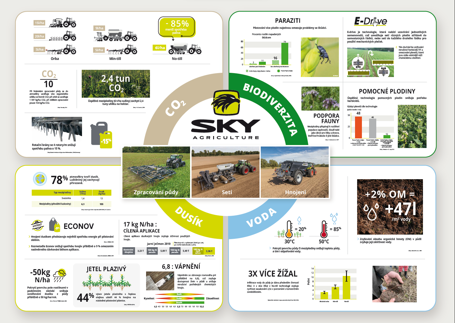Současná doba vyžaduje držet krok s požadavky zemědělců na preciznost a kvalitu zakládání porostů. Značka Sky v tomto směru udává trendy. Příkladem je např. možnost osadit secí stroje 3 nebo až 4 zásobníky, dle typu secího stroje, ovládanými přes ISOBUS. Pokročilou funkcí je variabilní ovládání výsevku všech těchto zásobníků osiva/hnojiva současně podle různých předpisových map. Se sekční kontrolou lze buď manuálně nebo automaticky vypnout polovinu secího stroje, díky čemuž dochází k úspoře osiva = nákladů. Důležitou vlastností secích strojů SKY jsou také rozdělovací hlavy E-Drive díky kterým si obsluha může nastavit libovolné násobky rozteče řádků nebo automatické vysévání kolejových řádků, nehledě na pracovním záběru postřikovače.
