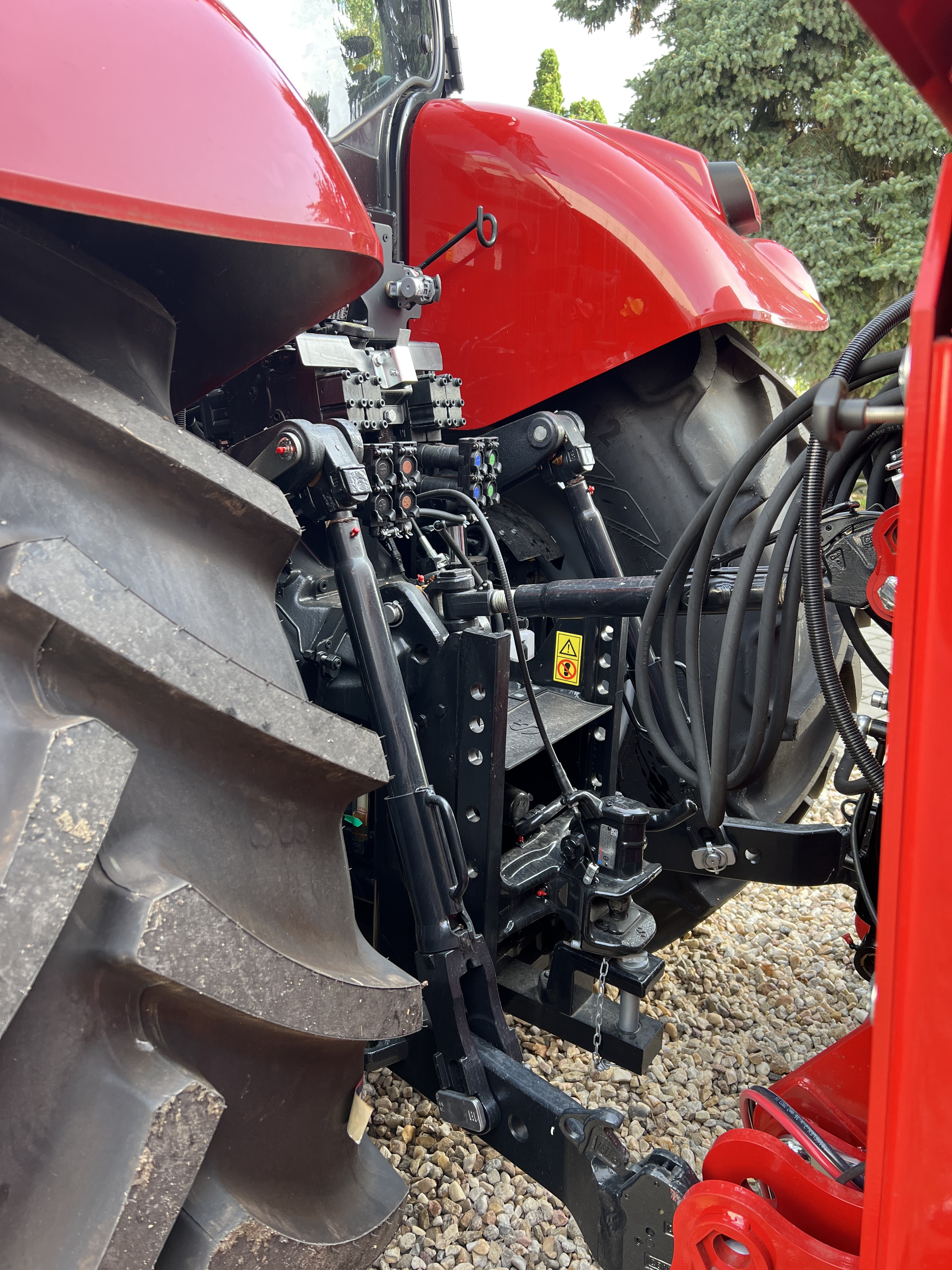 Elektronická regulace tříbodové závěsu (EDC) včetně regulace prokluzu kol (radar), max. zvedací kapacita závěsu 10460 kg – zvedací písty o průměru 110mm, tříbodový rychlozávěs Kat.II/III, auto stabilizátory závěsu, axiální Load Sensing čerpadlo s výkonem 150 l/min, max. tlak 215 bar, 4 elektronicky ovládané okruhy hydrauliky prostřednictvím loketní opěrky Multicontroller a joysticku, nastavení průtoku a časování hydraulických okruhů (max. průtok okruhů 140 l/min), možnost odebrat až 34 l oleje, ovládání zadního TBZ a jednoho okruhu na zadních blatníkách |