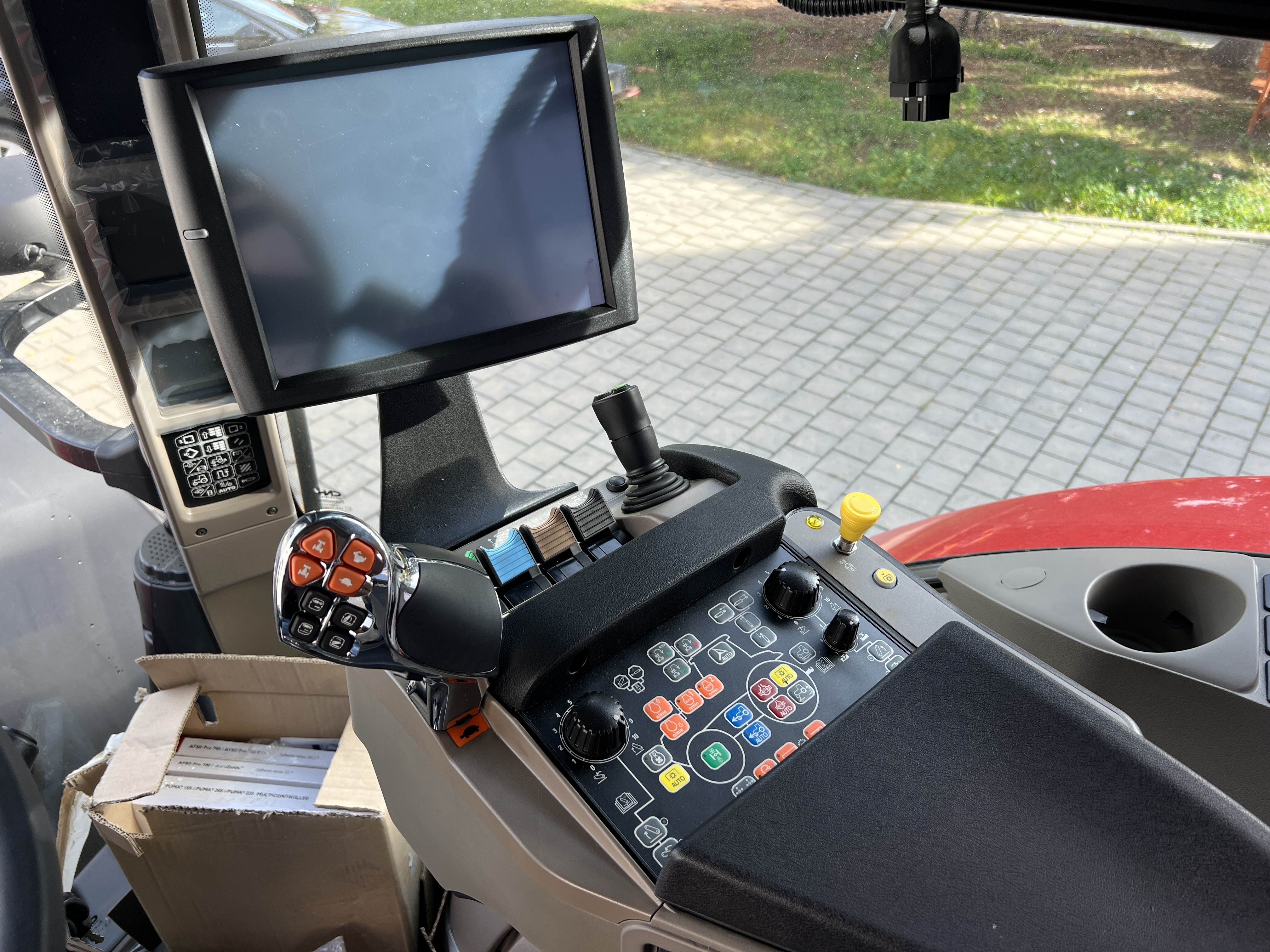 Nová ovládací loketní opěrka Multicontroller s multifukční pákou, sdružený ovladač Encoder s rychlým menu, barevný dotykový monitor AFS 1200 PRO, operační systém Vision Pro nastavení všech funkcí traktoru, barevný provozní monitor na A sloupku, konfigurovatelná ISO tlačítka. |