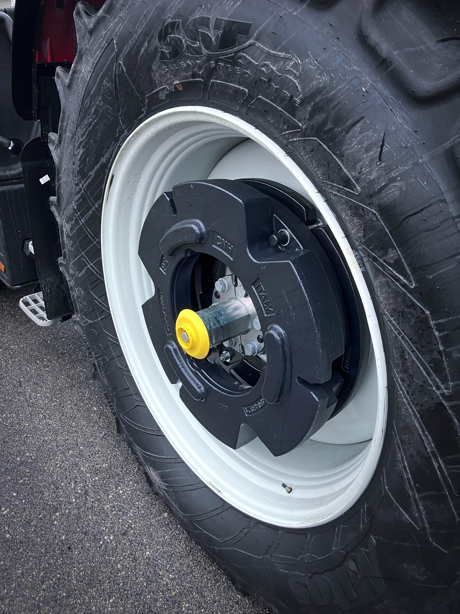 Standardní přední 600/65R28V a zadní 650/65R42 pneumatiky – přední dynamické blatníky o šíři 620 mm, závaží zadních kol 720 kg.