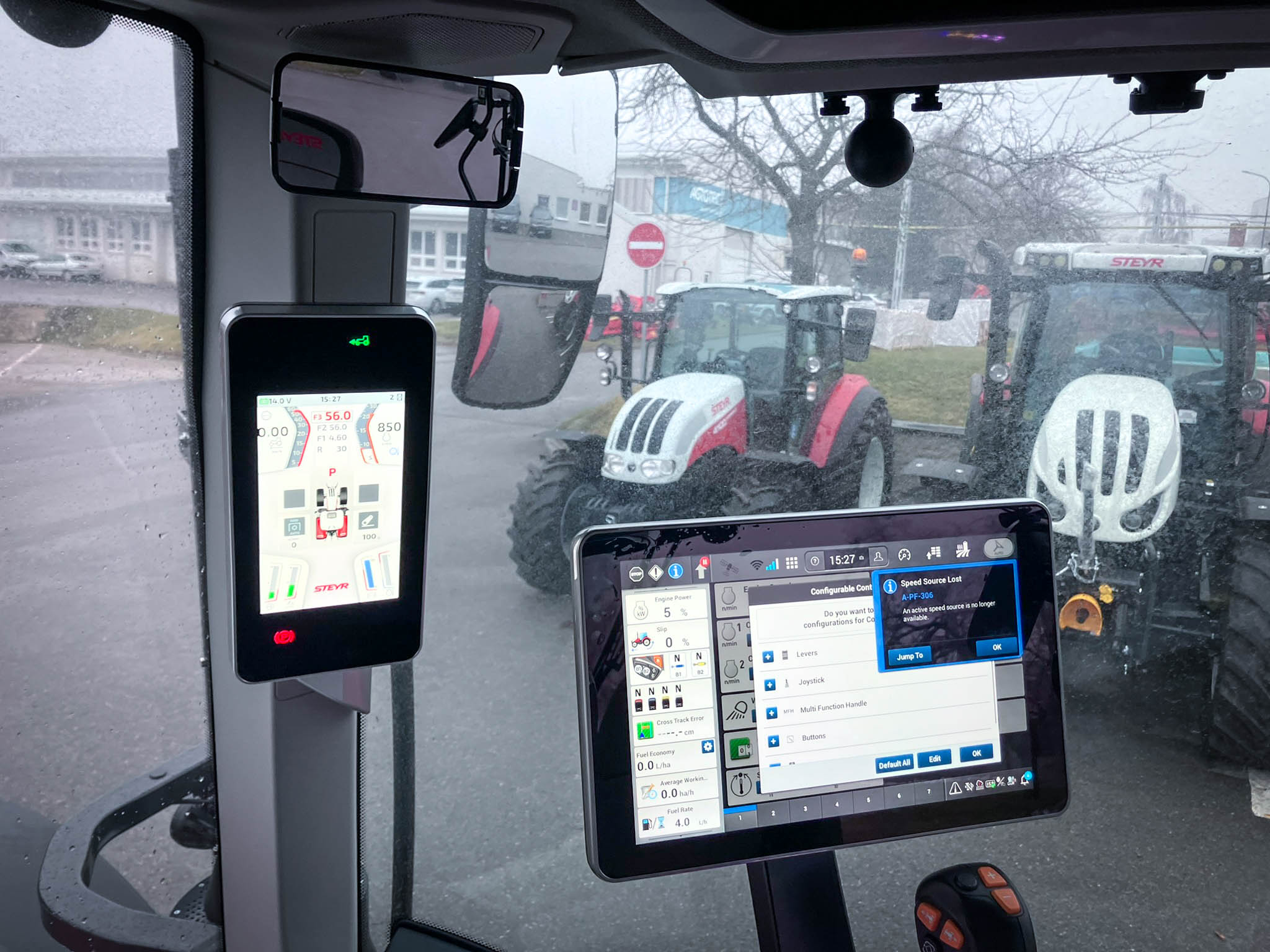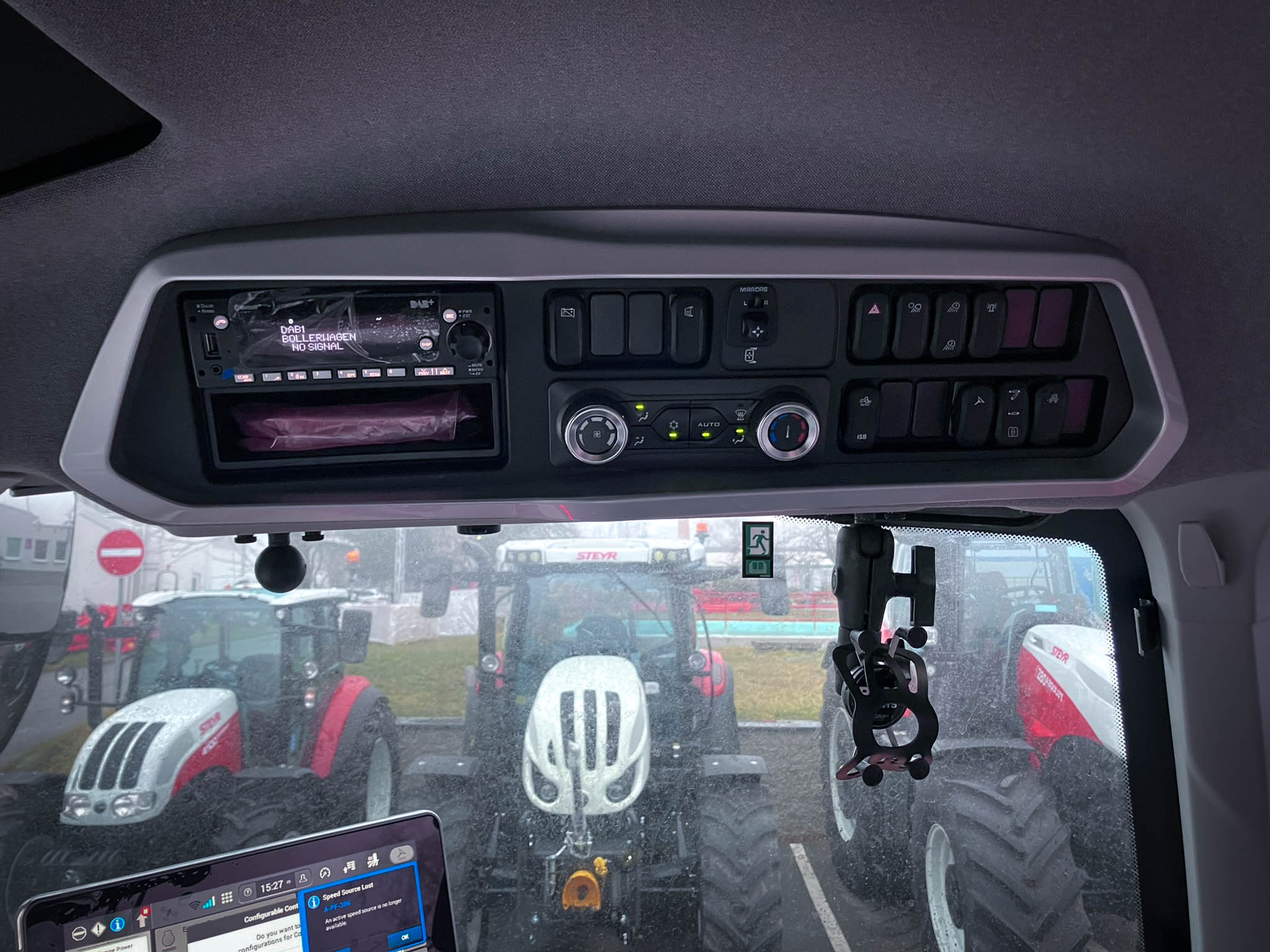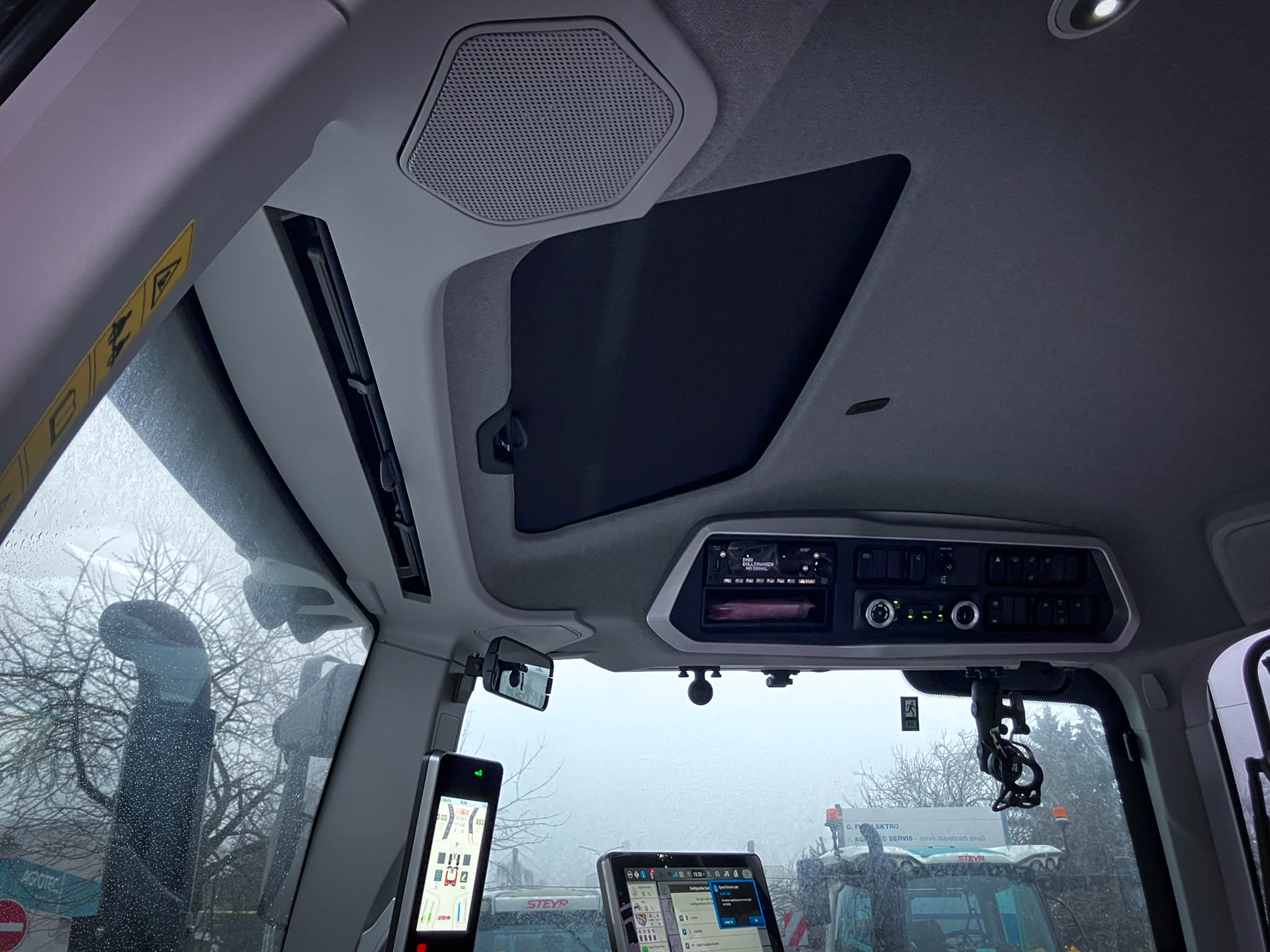 Pokročilý systém odpružení kabiny pomocí hydraulických jednotek, automatická klimatizace (66 dB (A)), topení a filtrace nasávaného vzduchu, otevíratelné střešní okno, nízkofrekvenční sedadlo řidiče Dual motion s vyhříváním, bezpečnostním pásem a přepínačem v provedení s vyšší zádovou opěrkou a s logem STEYR, pohodlná sedačka spolujezdce s bezpečnostním pásem, nastavitelný sloupek řízení ve dvou směrech, elektricky stavitelná loketní opěrka ve dvou směrech, barevná digitální přístrojová deska na sloupku A (analogové/digitální ukazatele), topení a větrání nastavitelné plynule, kožený volant prošívaný červenou nití a tkaný koberec STEYR, multifunkční loketní opěrka s enkodérem, konfigurovatelnými tlačítky pro rychlou volbu a Multicontrollerem III (změna tempomatu rychlosti, reverzace, zvedání ramen a ovládání el. vnějších okruhů + konfigurovatelná tlačítka), joystick s možností reverzace/změna tempomatů a pro volitelné ovládání vnějších hydraulických okruhů, barevné LED podsvícení pro každé pádlo pro elektronické vnější okruhy s možností vlastní konfigurace, USB port na loketní opěrce, zásuvky na 12 V, další 8 A, 30 A a ISO 17612, vyhřívaná a elektricky stavitelná zpětná zrcátka a jednou vnitřní zrcátko, 14 LED diodových pracovních světel na kabině + 4 LED v kapotě motoru a další 2 LED na blatnících vzadu + 4 LED na sloupku A + alternativní světla pro jízdu po sil. komunikaci na sloupku A, přední a zadní stěrač s ostřikovačem, sluneční clona na střešní a čelní sklo, sluneční clona na střešní a čelní sklo, tónované zadní okno se sluneční clonou, pokročilý program RAM na pravé straně pro externí monitory, držák RAM na mobil, chladící box po sedačkou spolujezdce (velikost na 2 PET o objemu 2,5 l a svačinu), držák registrační značky ve střeše pro vysokou střechu, elektronický odpojovač akumulátoru v kabině i u nástupních schodů, radar pro řízení prokluzu, LED maják na levé i pravé straně, dotykový monitor INFOMAT 1200 na loketní opěrce s ISOBUS II, souvraťový management EASY TRONIC II. STEYR SOUND SYSTEM, Rádio s Bluetooth s čtyřmi výkonnými reproduktory a SUBWOOFEREM.
