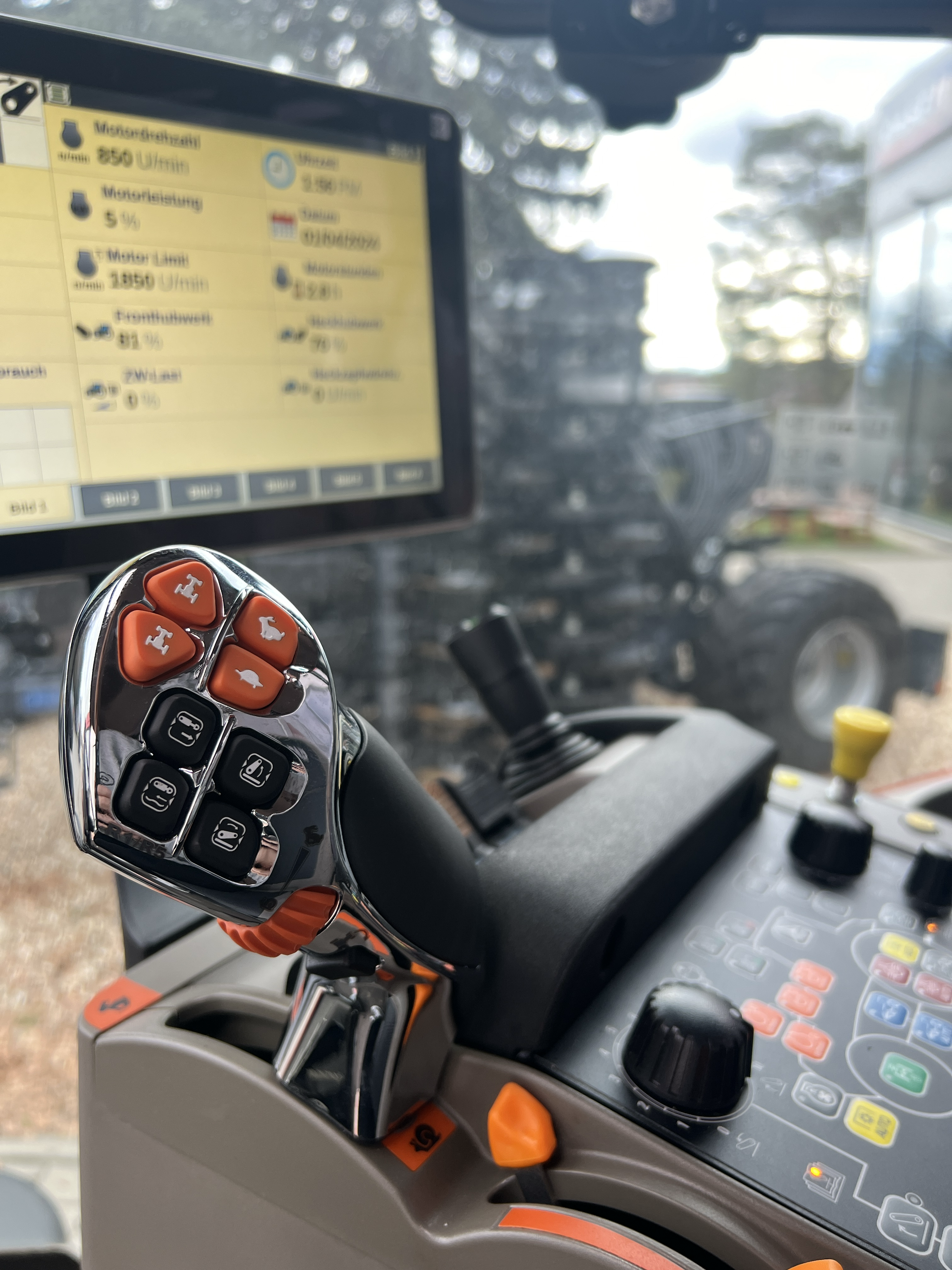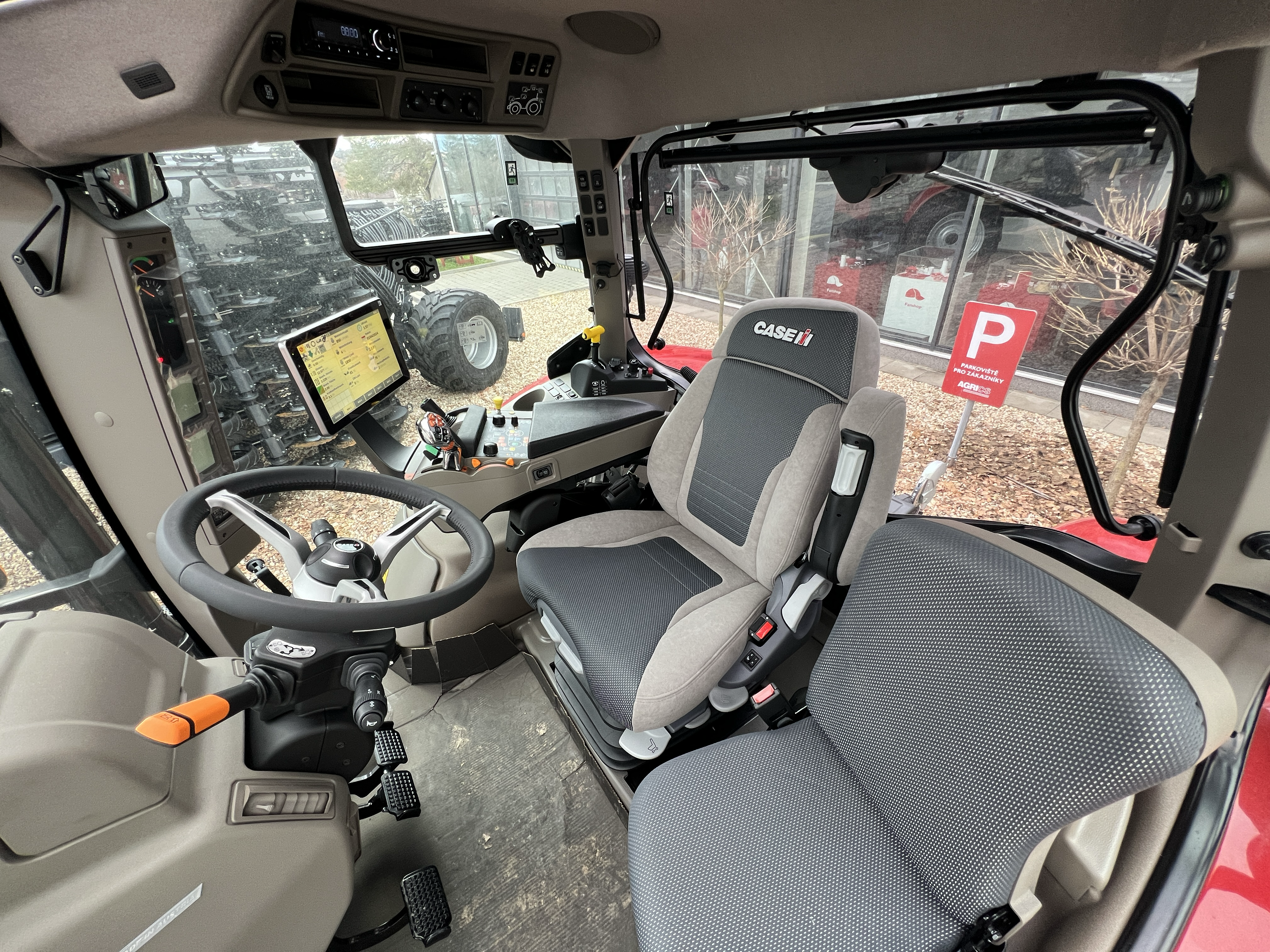 Komfortní čtyř sloupková odpružená kabina „Surround Vision“ s topením a filtrací nasávaného vzduchu, hlučnost 69 dB(A), tónovaná skla kabiny, sluneční clona předního a zadního okna, otevíratelné střešní okno, nastavitelný sloupek řížení a výškově volant, chlazená schránka na nápoje před volantem, teleskopická dvojitá vnější zpětná zrcátka, digitální přístrojová deska v A sloupku, audio příprava, přední stěrač 235°, zadní stěrač a ostřikovač.