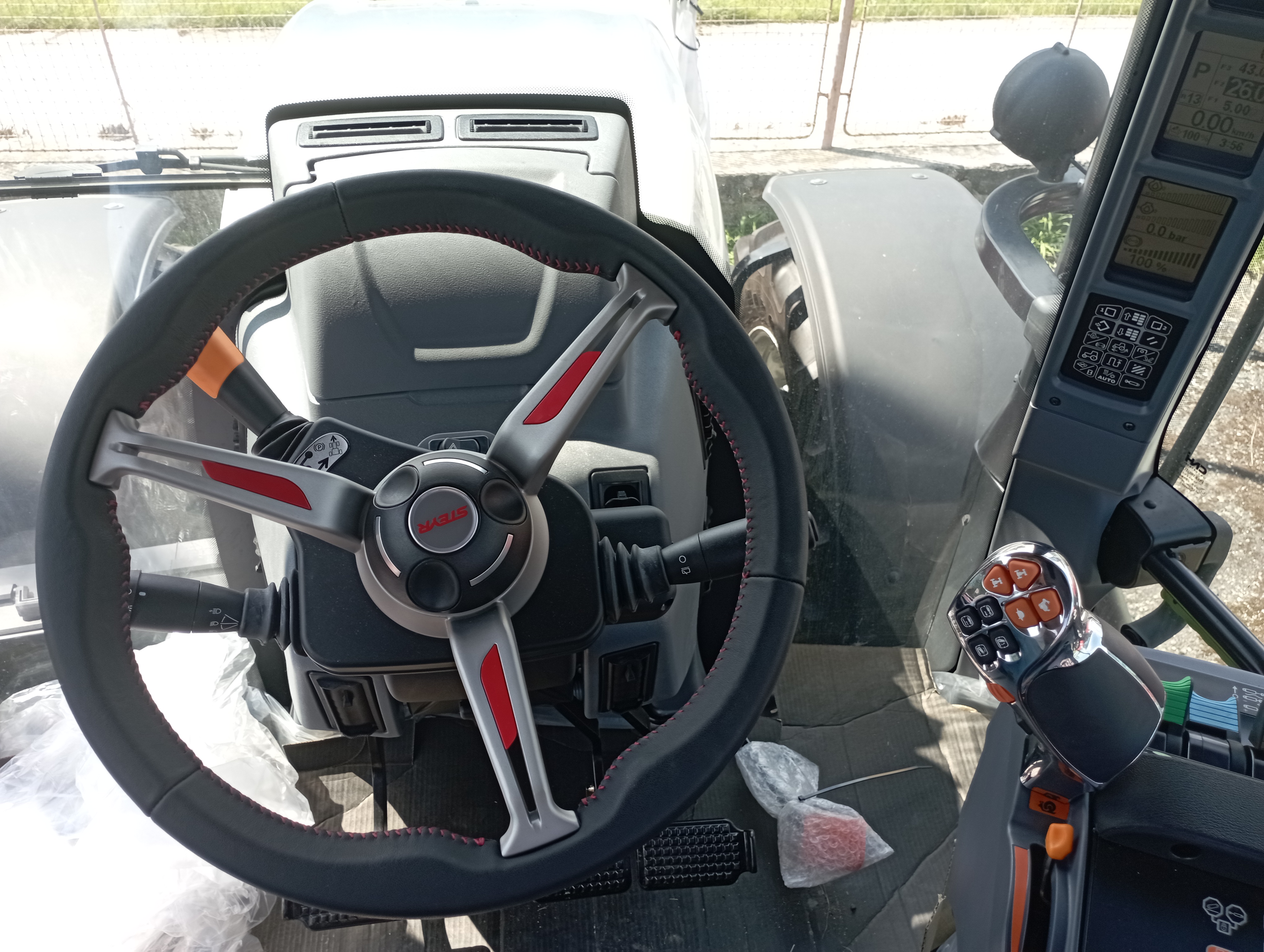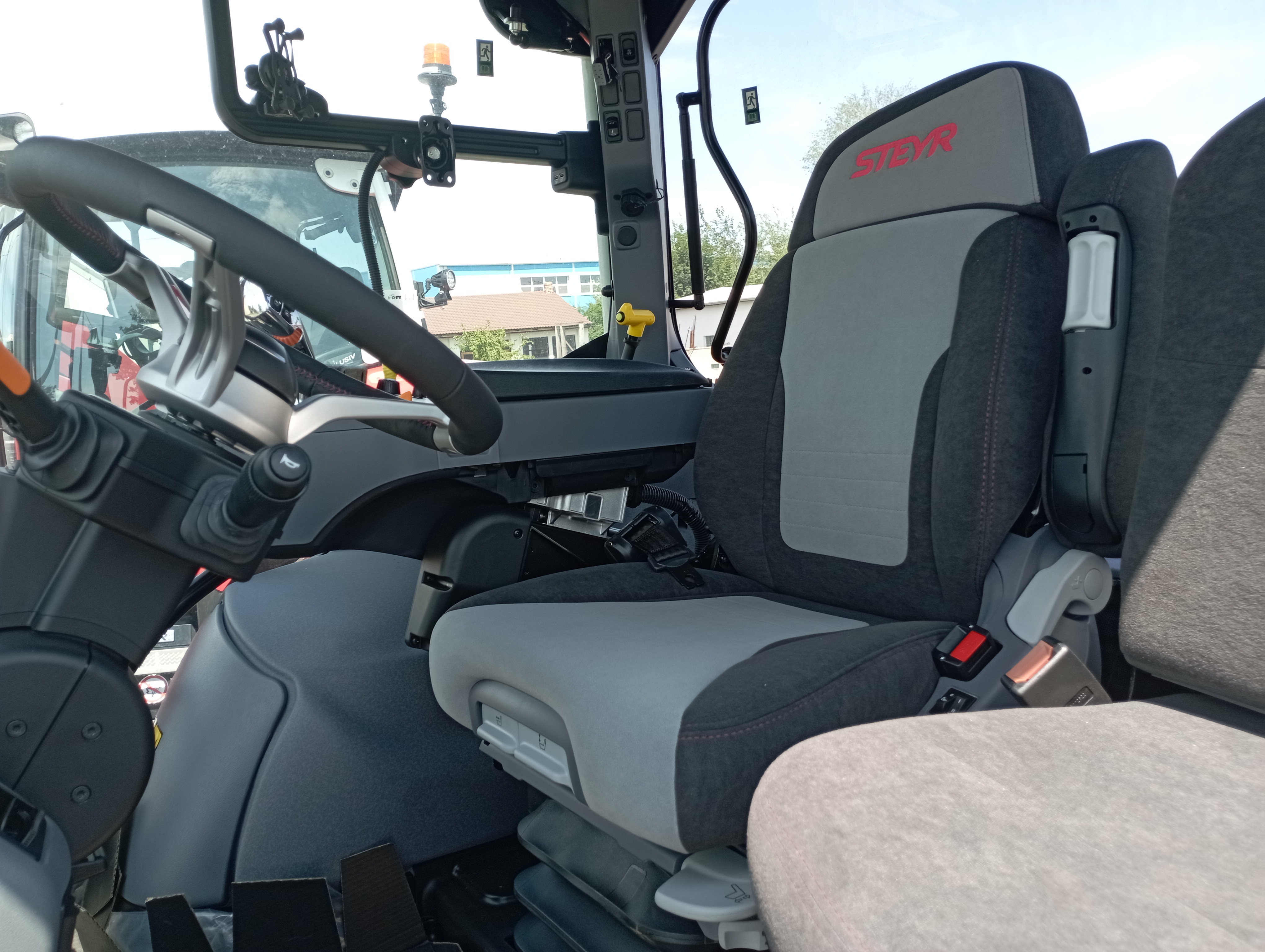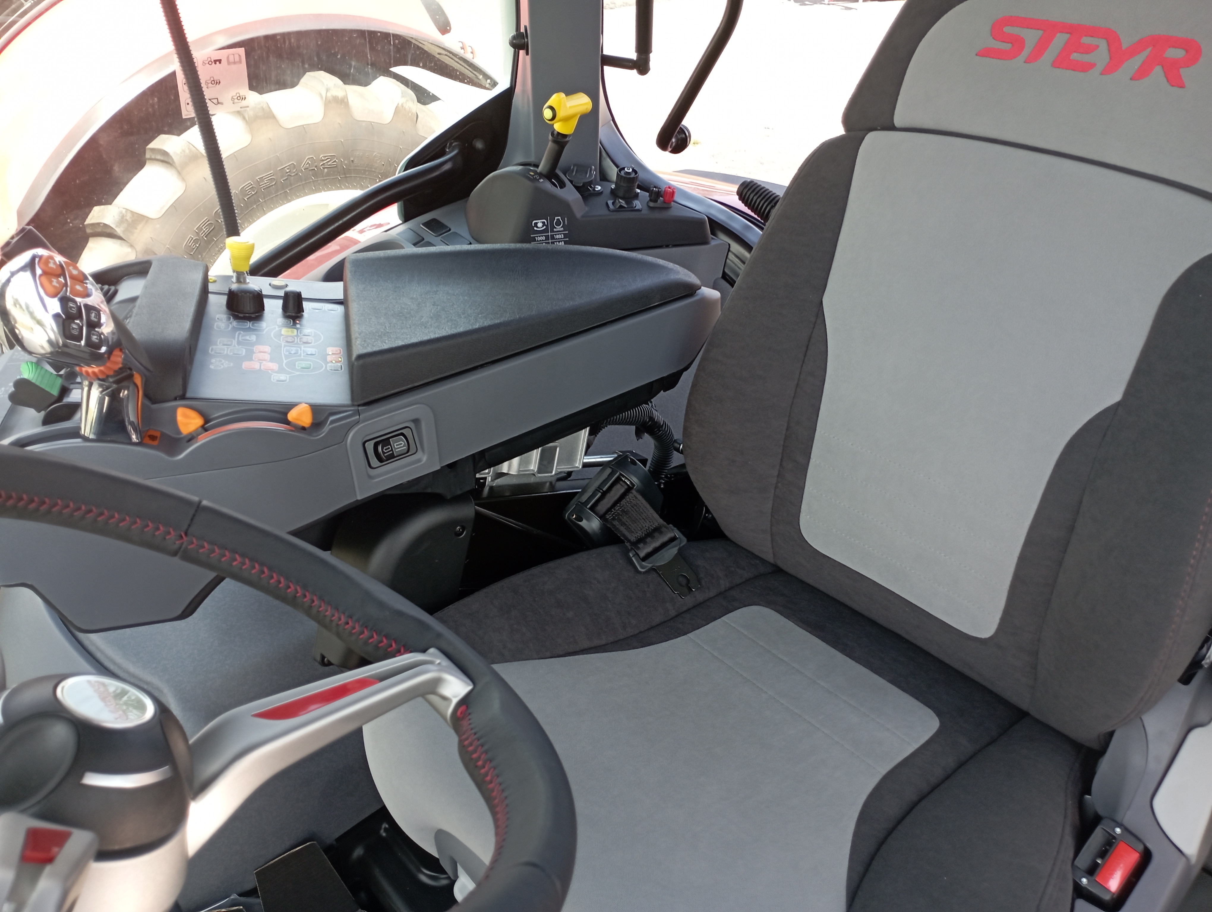 Komfortní odpružená kabina s manuální klimatizací (71 dB (A)), topením a filtrací nasávaného vzduchu, otevíratelné střešní okno, nízkofrekvenční sedadlo řidiče Dual motion s vyhříváním, bezpečnostním pásem a přepínačem v provedení s vyšší zádovou opěrkou a s logem STEYR, pohodlná sedačka spolujezdce s bezpečnostním pásem, nastavitelný sloupek řízení ve dvou směrech, digitální přístrojová deska na sloupku A (analogové/digitální ukazatele), topení a větrání nastavitelné ve 3 stupních, kožený volant prošívaný červenou nití a tkaný koberec STEYR, multifunkční loketní opěrka s panelem ICP a Multicontrollerem (změna tempomatu rychlosti, reverzace, zvedání ramen a ovládání el. vnějších okruhů), zásuvky na 12 V, další 8 A, 30 A a ISO 17612, rádio s Bluetooth a reproduktory, 2 teleskopická vnější zpětná zrcátka a jednou vnitřní zrcátko, 12 LED pracovních světel na kabině + 2 LED na kapotě motoru + alternativní světla pro jízdu po sil. komunikaci na sloupku A, přední stěrač s úhlem stírání 235° a zadní stěrač s ostřikovačem, sluneční clona na střešní a čelní sklo, tónované zadní okno se sluneční clonou, pokročilý držák externích monitorů na pravé straně se dvěmi USB zásuvkami a držákem RAM na mobil, chladící box před volantem, držák registrační značky ve střeše pro vysokou střechu, elektronický odpojovač akumulátoru v kabině i u nástupních schodů, LED maják na levé straně, schránka na nářadí, souvraťový management EASY TRONIC II. |