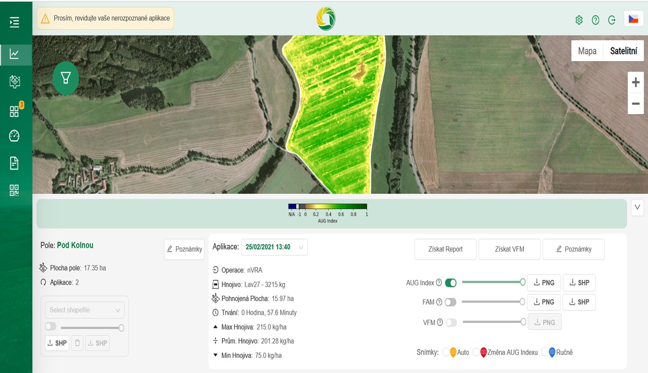 Součástí služby Augmenta je i webový portál v českém jazyce, který slouží pro evidenci aplikace. Rovněž zde najdete naměřenou variabilitu pozemku a mapu aplikace. Dále portál nabízí zobrazení automaticky pořízených fotografií porostu a výkonnostní data soupravy. Mezi zajímavá čísla patří i velikost úspory aplikovaného produktu. Do webového portálu lze nahrávat předpisové mapy, které se dále mohou kombinovat s optickým skenerem porostu.